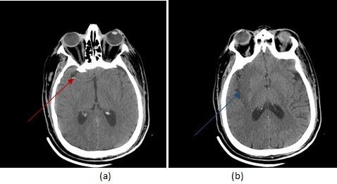 Figure 1: (a,red arrow) axial non contrast CT demonstrates a hyperdense middle cerebral artery. There is loss of grey white differentiation involving the insular cortex and right basal ganglia (b,blue arrow).
