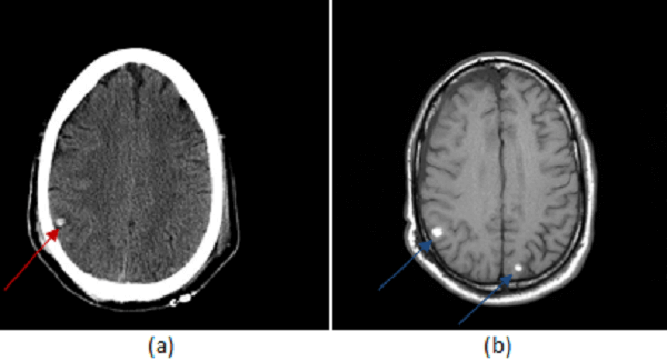 Figure 1: (a, red arrow) non contrast head CT shows a small hemorrhagic contusion in the right parietal lobe. (b, blue arrow) T1 weighted imaging demonstrates two small foci of T1 hyperintense signal consistent with hemorrhage at the grey white junction. (c, green arrow) T2* imaging is most sensitive for blood and intracranial trauma, demonstrating the hemorrhagic contusions identified in (a) and (b) but also a focus of diffuse axonal injury in the left frontal white matter (brown arrow). (Note the hemorrhages are INTRA-axial, not extra-axial as suggested by the answers.)