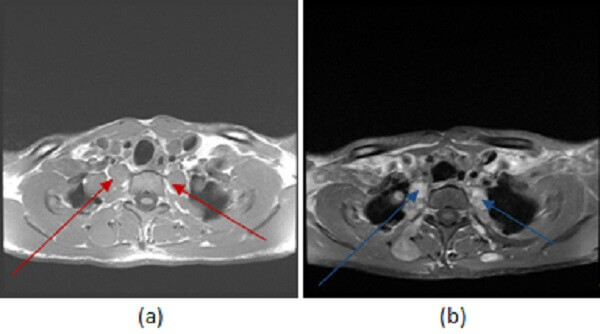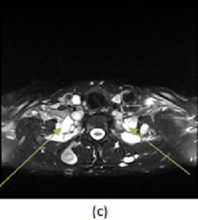 Figure 1: (a, red arrow) axial T1, (b, blue arrow) T1 post contrast and (c, green arrow) T2 with fat suppression demonstrate multiple T2 hyperintense, homogenously enhancing ovoid and dumbbell shaped masses, many in contiguity with the neural-foramina, most consistent with neurofibromatosis.