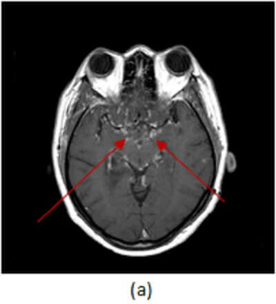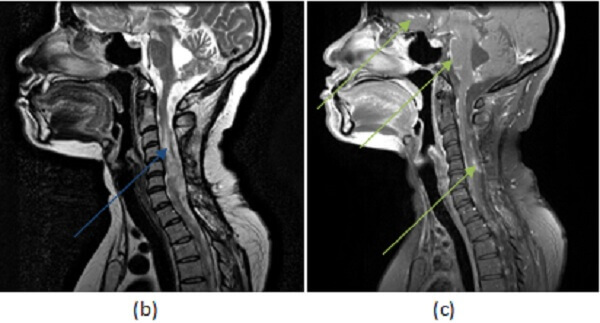 Figure 1: (a, red arrow) axial postcontrast T1 demonstrates enhancement of the leptomeningeal surface along the basal cisterns. (b, blue arrow) Sagittal T2 of the spine demonstrates increased T2 signal involving an expanded cervical cord. (c, green arrow) Sagittal T1 post contrast of the spine and brain demonstrates intramedullary and leptomeningeal enhancement of the cervical cord, along with parasellar, frontal and cerebellar leptomeningeal enhancement.