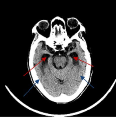 Figure 1: (red arrow) temporal horns of the ventricles are dilated out of proportion to sulcal atrophy, a finding suggestive of NPH.