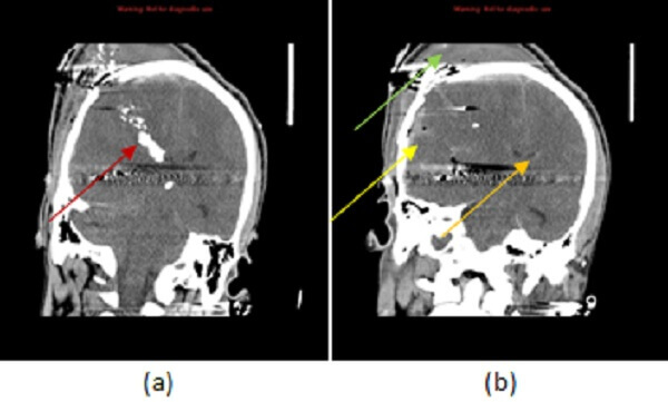 Figure 1: Unenhanced Head CT, Sequential images. (a) GSW with entrance wound in the high right parietal bone extending to the right ventricle (red arrow). Associated with traumatic subarachnoid hemorrhage, pneumocephalus (yellow arrow for both) and right to left midline shift (orange arrow Subgaleal hematoma (green arrow).