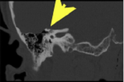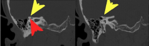 Figure 1: Coronal reformats from a temporal bone CT (using a bone reconstruction algorithm with thin sections through the right internal auditory canal) demonstrate absence of bone (yellow arrow) covering the roof of the superior surface of the semicircular canal (red arrow). This finding is pathogmnemonic for dehiscence of the superior semicircular canal.