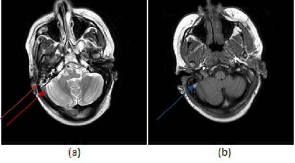 Figure 1: (a, red arrow) T2 and T1 (b,blue arrow) images demonstrate increased signal in the right sigmoid sinus. This finding could be due to either thrombosis or slow venous flow. There is also fluid in the mastoid air cells (purple arrow)- while fluid in the mastoid air cells is typically sterile, fluid can reflect infection in the case of mastoiditis, and mastoiditis predisposes to venous thrombosis.(c,green arrow) 3-D reconstructions from an MR venogram demonstrate abrupt cut off of contrast in the right transverse sinus with the suggestion of collateral flow (brown arrow) more consistent with thrombosis.