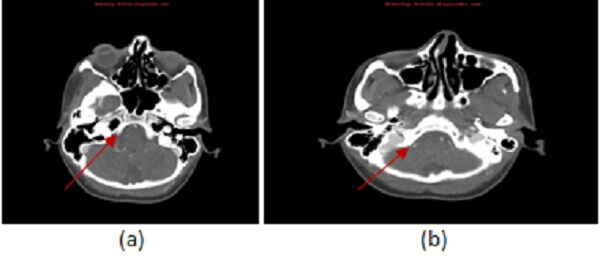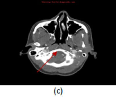 Figure 1: (a)-(c) Sequential axial images from a CT angiogram of the head and neck demonstrate an abrupt caliber change of the distal right V4 segment of the vertebral artery (red arrows) tapering in a “string” sign consistent with the diagnosis of dissection.