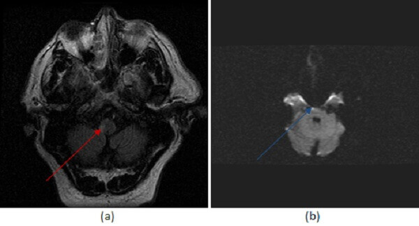 Figure 1: (a, red arrow) FLAIR images demonstrate increased signal involving the right lateral medulla (b, blue arrow) diffusion weighted imaging demonstrates focal increased signal in a smaller portion of this territory consistent with an acute or early subacute infarct.